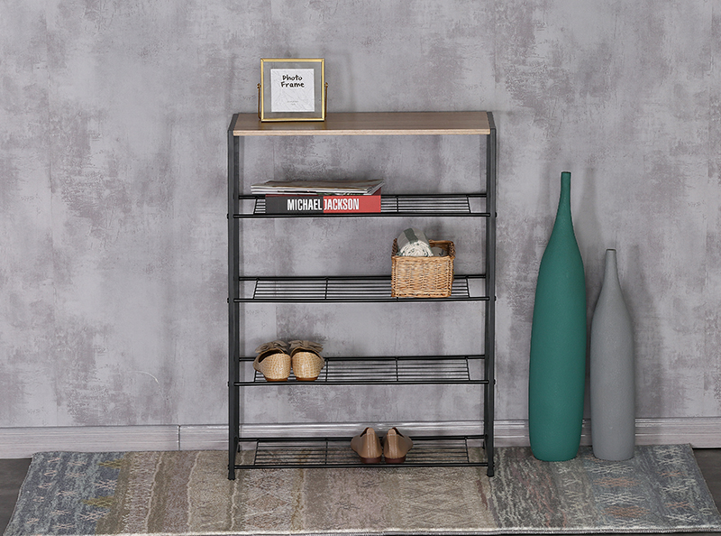 ◎Black Metal Shoe Rack with Wooden Top Plate
